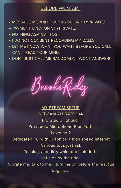 NOT YET, Register for freeYou need to ADD FUNDS to your account so you can call BrookeRides or any other model. This a secure system that allows you to pay for PAY-PER-MINUTE private Skype Shows.